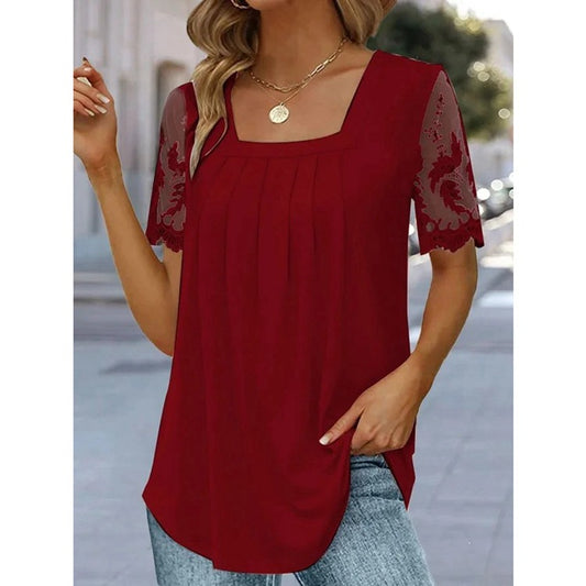 🔥🔥【Ograniczona ilość sztuk✨】【S-5XL】🎉2025 Nowy modny jednolity kolor kwadratowy dekolt koronka krótki rękaw-3938505