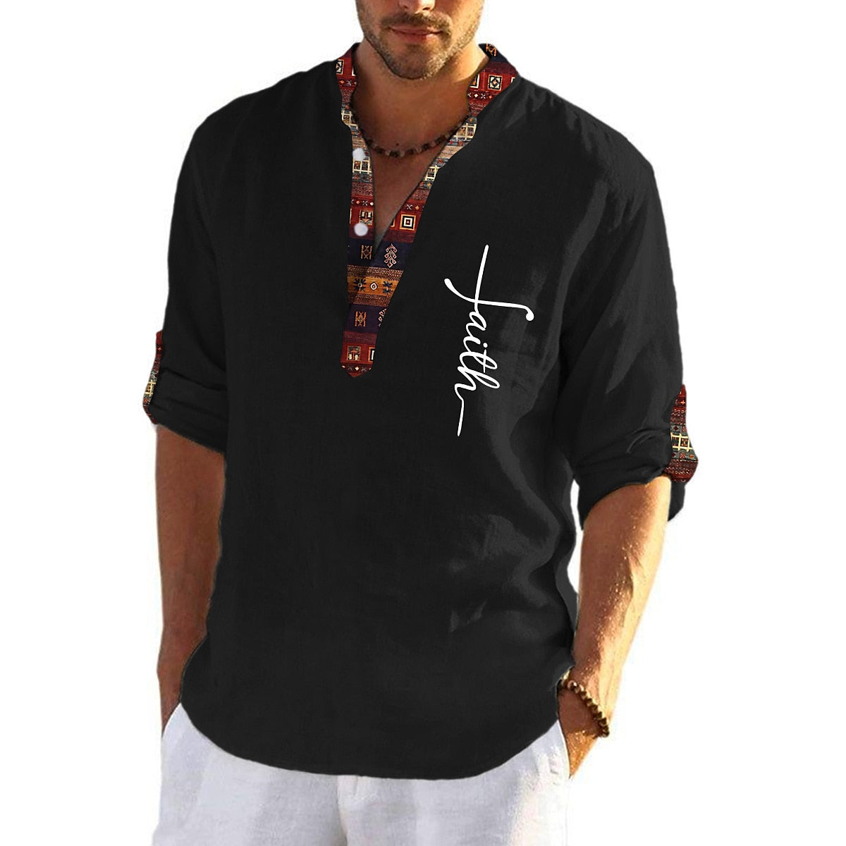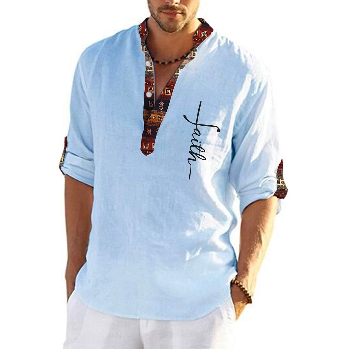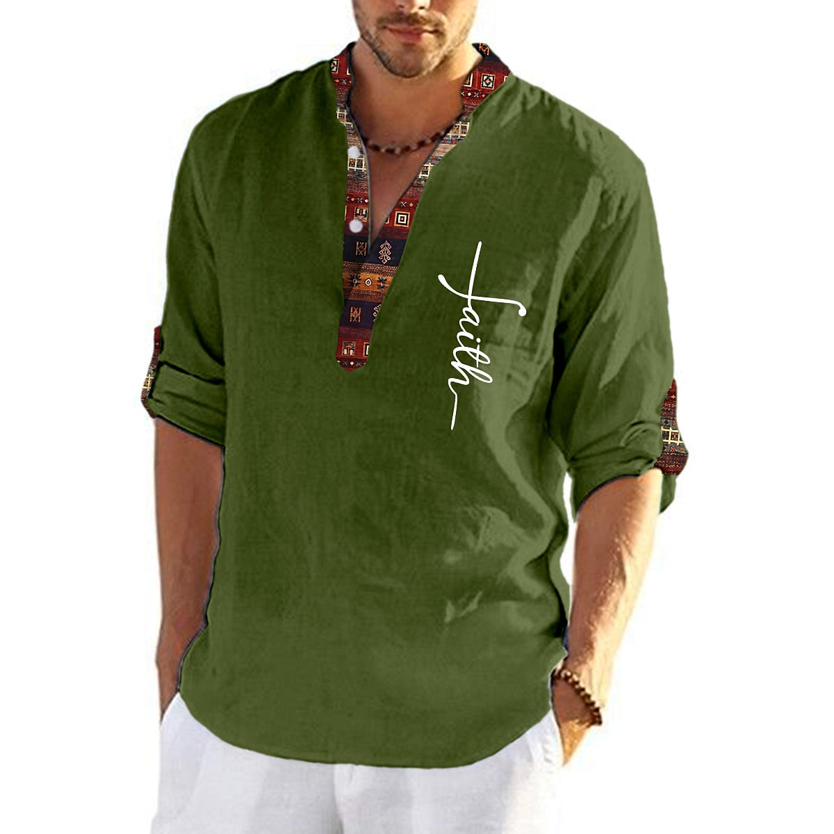 🔥Promocja ograniczona czasowo🔥Męska lniana, bawełniana koszula z nadrukiem i dekoltem w kształcie litery V-3906378